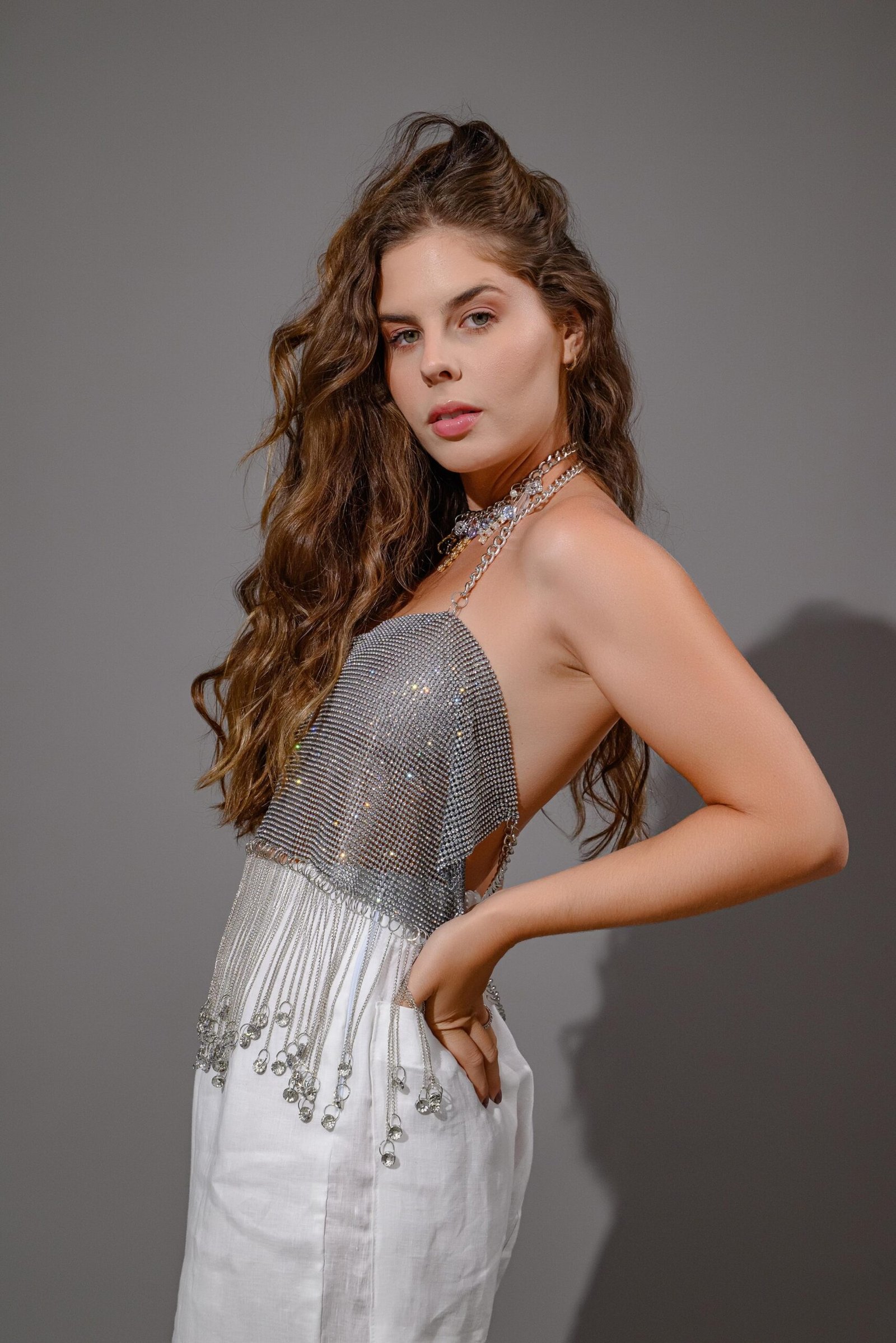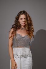 Cropped em metal com correntes de franjas tamanho único com reguladores.Brilho intenso e lindo!