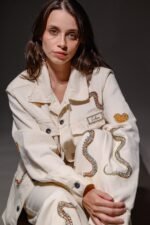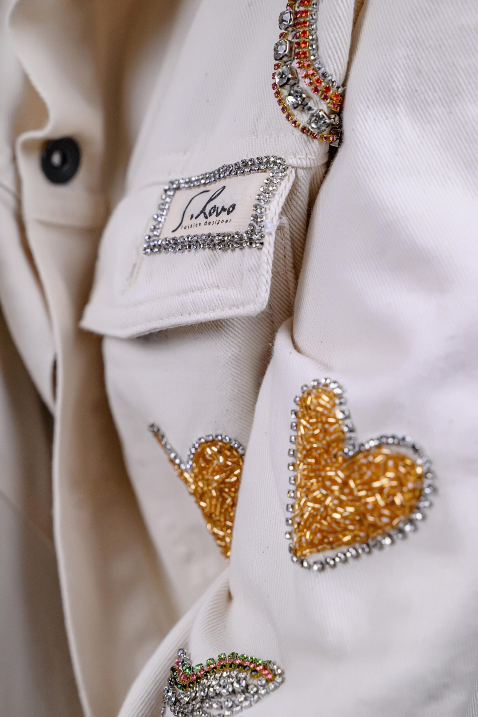 Jaqueta em brim, com bordados de vidrilhos, canutilhos e strass, para compor looks incrivéis.